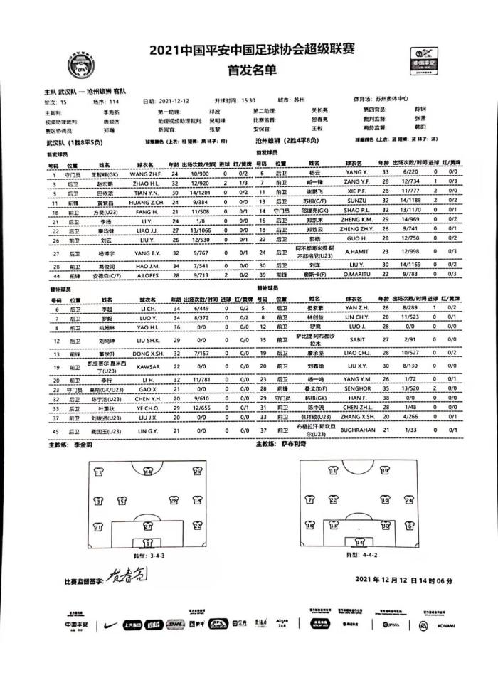 JRS直播网12月12日讯 ,中超联赛保级组的比赛正式展开争夺,武汉队对阵沧州雄狮。本场比赛的首发出炉。