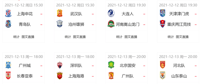 JRS直播网讯 北京时间12月12日和13日,中超联赛保级组和争冠组的比赛展开争夺。第15轮的比赛,争冠组广州队和国安的对决还是值得关注,两队本土球员的表现是个看点。泰山队对阵河北,要全力拿到3分。保级组青岛队、大连队的积分较少,他们每场比赛都非常关键,争取拿到分数。