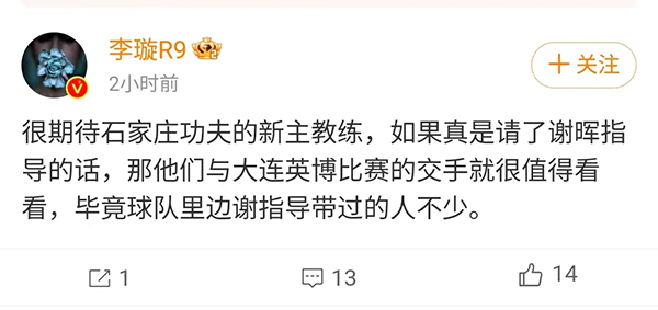 值得一提的是,除了谢晖和石家庄功夫俱乐部传出了绯闻之外,在石家庄功夫最近的比赛中,前中国男足主教练扬科维奇也是出现在现场观赛,这位来自于塞尔维亚的名帅或将成为谢晖此次回归的最主要竞争对手。