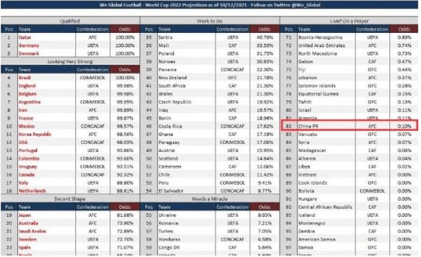 当国足与沙特的比赛结束之后,《We Global Football》的分析是,国足晋级世界杯的概率从6.68%跌到了0.1%,千分之一的概率可以用仅剩理论可能来形容了场,从这点就可以看出国足在目前小组中处于绝对的劣势。