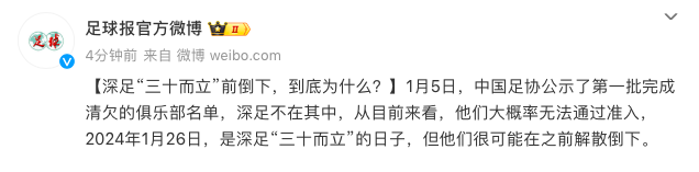 JRS直播网01月09日讯 ,来自国内知名媒体《足球报》的透露,由于大概率无法通过准入,前中超冠军深圳队很可能选择解散。本月26日,是深圳队成立30周年的日子,而这支中超前冠军可能会在“三十而立”之前,就无奈倒下。