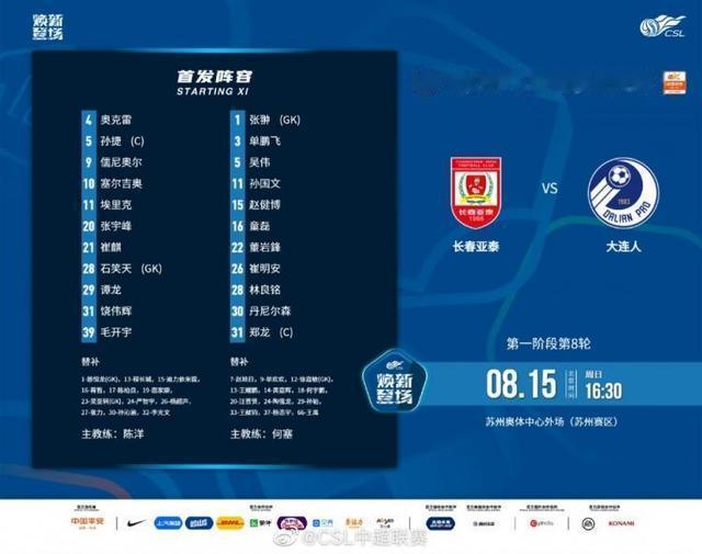 JRS直播网讯 中超第8轮补赛,苏州赛区第一阶段收官战,长春亚泰vs大连人首发出炉。