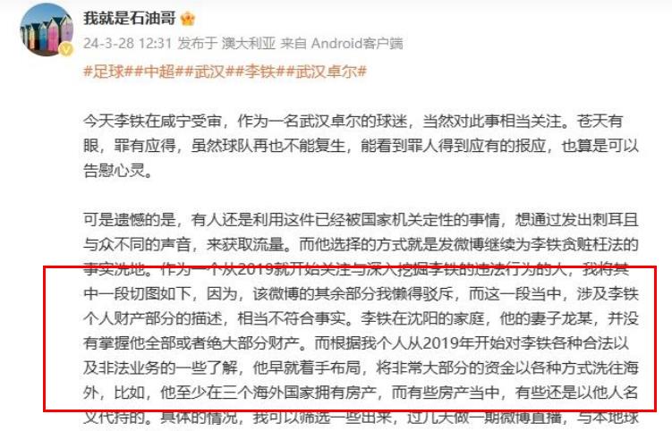 李铁的妻子龙某并没有出国,那龙某有能力退赃吗?或许名记“我就是石油哥”的爆料也是给出了最好的答案。在社交媒体上,“我就是石油哥”表示:李铁的妻子龙某并没有掌握李铁全部或者绝大部分财产,根据我个人从2019年开始对于李铁各种合法以及非法业务的了解,他早就着手布局,将非常大部分的资金以各种方式带到了海外。