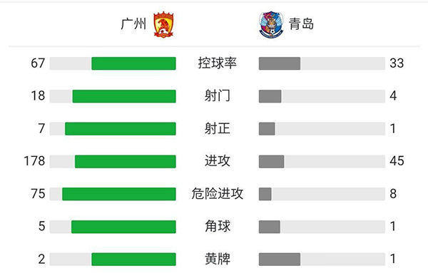 全场比赛结束,广州队5-0大胜青岛队,送给对手九连败。