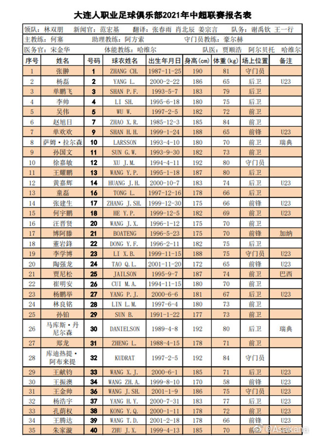 2021-22赛季中超大连人球员名单一览