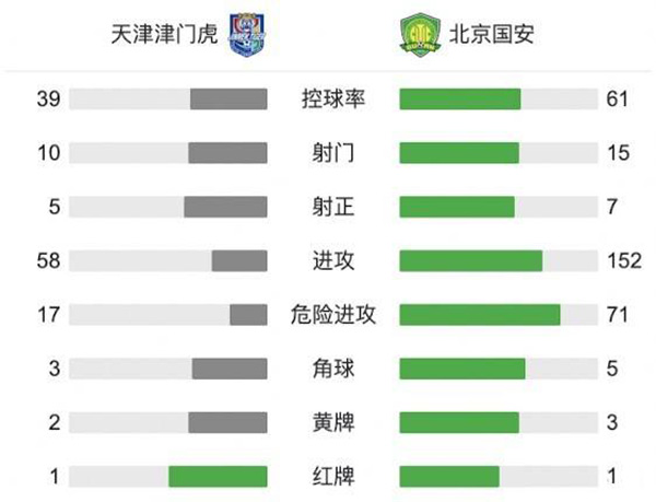 全场比赛结束,天津津门虎3-1击败北京国安,终结六轮不胜。