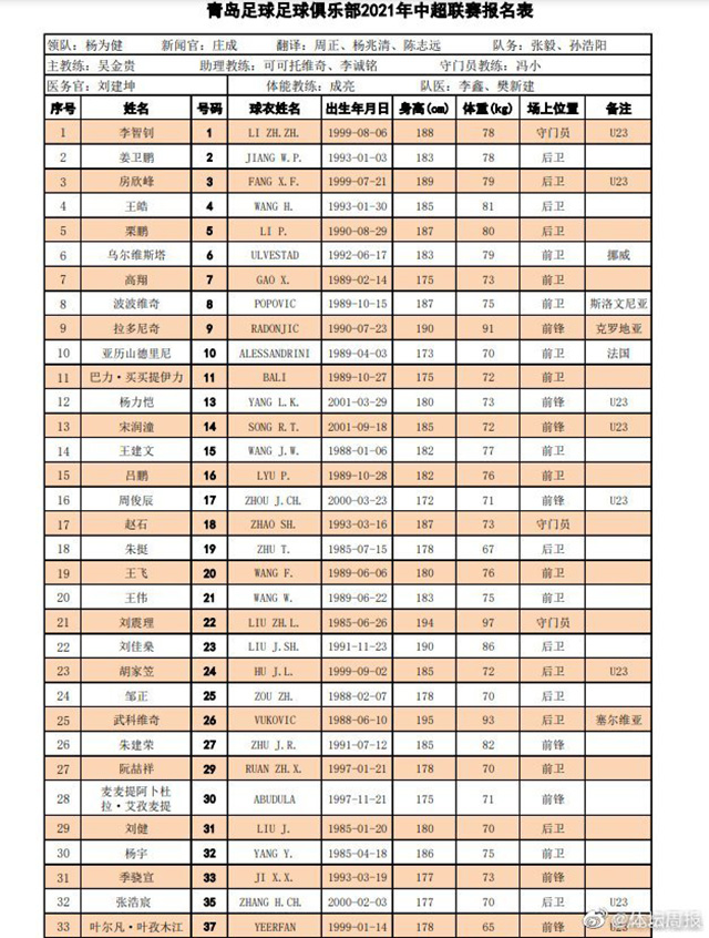 青岛队球员名单:
