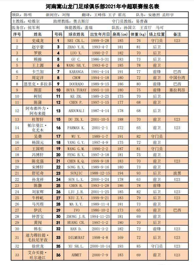 河南嵩山龙门球员名单: