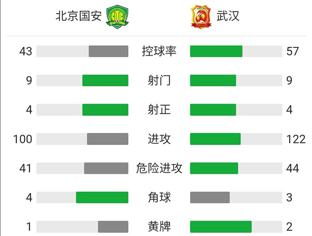 全场比赛结束,北京国安2-1战胜武汉。