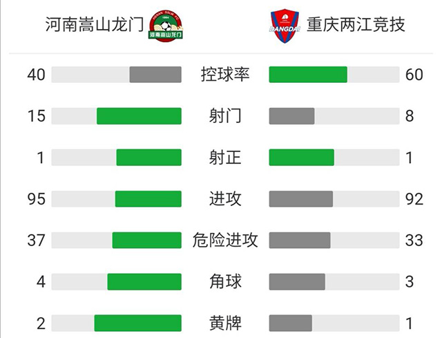 第11分钟,河南嵩山龙门取得领先,在前场完成抢断后,卡兰加沿禁区线横向盘带,右脚劲射得手,河南嵩山龙门1-0领先重庆两江竞技。