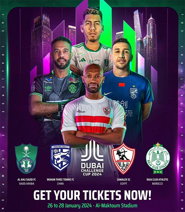 迪拜挑战杯将于2024年1月26日至28日在阿联酋迪拜阿尔马克托姆体育场(Al Maktoum Stadium)进行,武汉三镇携手沙特吉达国民、埃及扎马雷克体育以及摩洛哥卡萨布兰卡拉贾参加该项赛事。