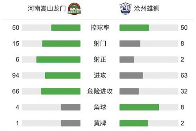全场比赛结束,河南嵩山龙门2-1沧州雄狮。