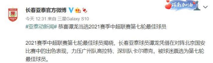 JRS直播网讯 北京时间7月24日,长春亚泰官方宣布,队内前锋谭龙当选中超第7轮最佳球员。