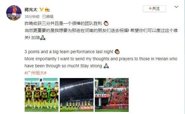 JRS直播网讯 昨晚,中超第7轮,广州队6-0战胜了青岛队。比赛结束后,广州队球员蒋光太发微博为正在遭遇洪灾的河南人民送去了祝福。