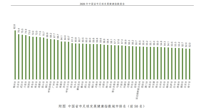 中国省市足球发展健康指数城市排名,第一是梅州市,其次是北京市和武汉市。前十还有大连市、深圳市、青岛市、南京市、成都市、梅州市、丽江市。