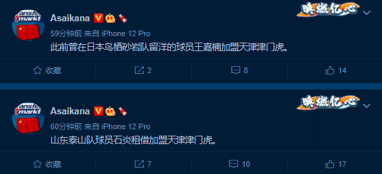 JRS直播网7月15日讯 ,德转中国区管理员朱艺在微博上更新了两条天津津门虎的转会消息。石炎和王嘉楠两名球员加盟天津津门虎。