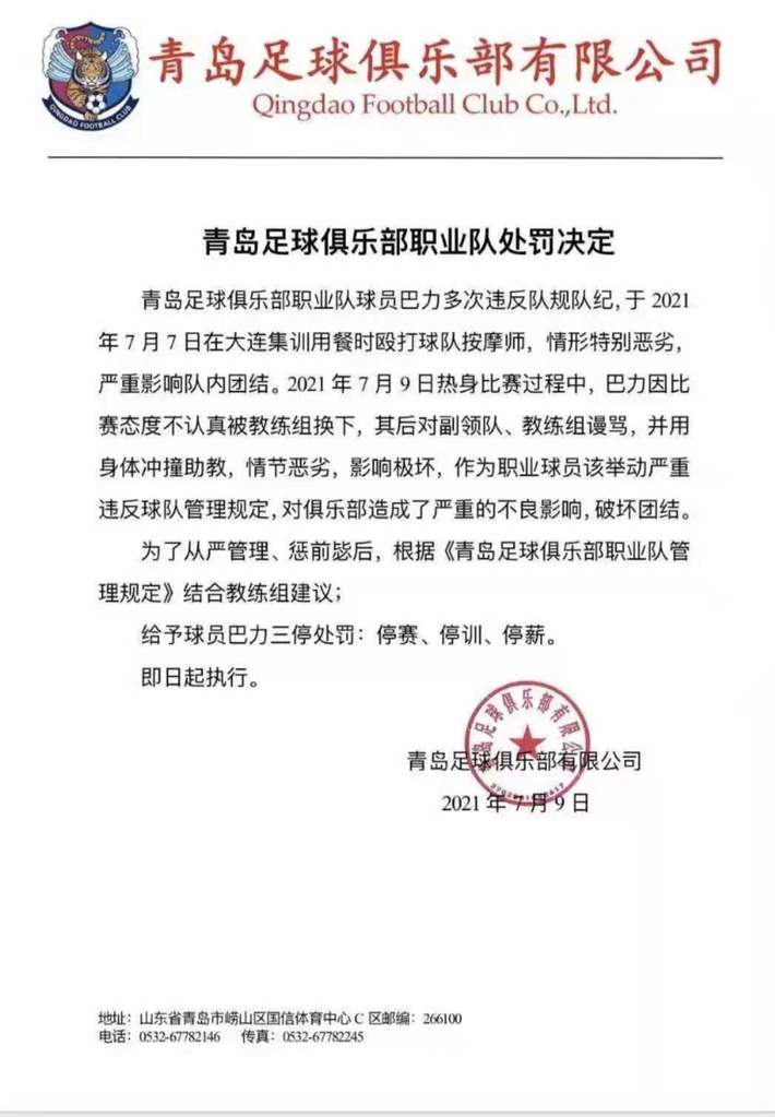 JRS直播网讯 北京时间7月10日,据青岛媒体《青岛日报》报道,青岛队内球员巴力因殴打按摩师被俱乐部三停处罚。