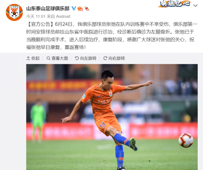 JRS直播网讯6月25日,山东泰山队官方发布球员张弛的伤情。在24日的队内比赛中,张弛受伤离场,经诊断后确诊为左腿骨折。24日晚,张弛顺利完成手术,进入后续治疗、康复阶段。这是张弛职业生涯第3次遭遇骨折,从时间节点看,他很难赶上本赛季的剩余比赛,泰山队球迷为他送上祝福。