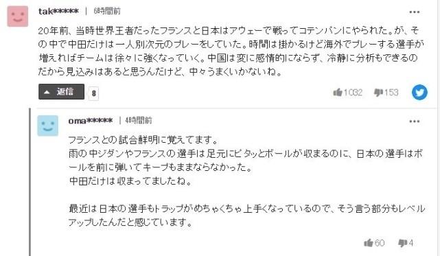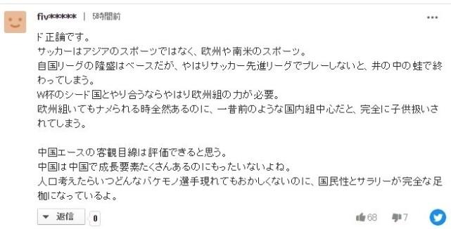 而不少日本网友对于武磊的观点感同身受:“记得20年前,日本在和世界杯冠军法国男足交手时,也只有中田英寿一个留洋球员。那场比赛,日本球员都办法控好球,只有中田可以。不过现在日本球员的基本功水平都已经有很大的提升了。如果留洋球员增多,球队的实力就会逐渐增强,但这需要时间。我认为中国也有很多很有潜力的球员,如果未来走在正确道路,中国男足还是可以期待的!”;“我很理解为什么中国足球现在这个样子,这跟以前日本足球的情况很像。在提高亚洲足球整体水平的角度上,我希望中国队能够更加强大。”