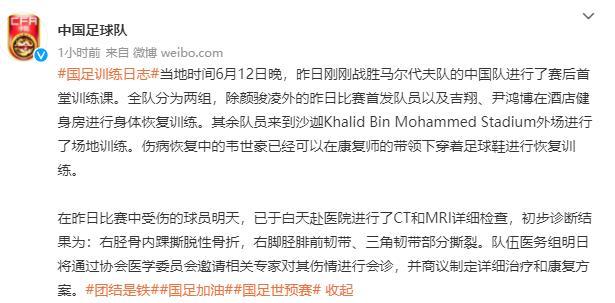 JRS直播网讯 据中国足球队官方消息,球队后卫明天右胫骨内踝撕脱性骨折,右脚胫腓前韧带、三角韧带部分撕裂。