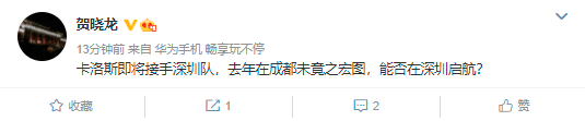 JRS直播网讯 贺晓龙在微博中写道:“卡洛斯即将接手深圳队,去年在成都未竟之宏图,能否在深圳启航? ”