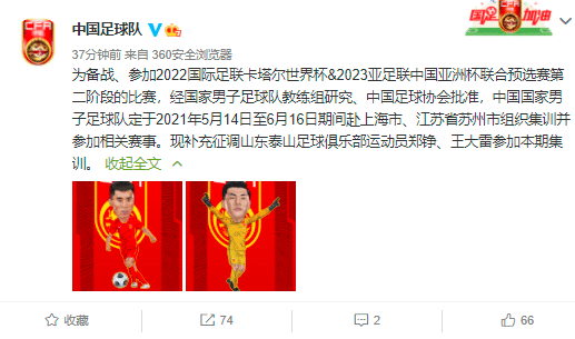 为备战、参加2022国际足联卡塔尔世界杯&2023亚足联中国亚洲杯联合预选赛第二阶段的比赛,经国家男子足球队教练组研究、中国足球协会批准,中国国家男子足球队定于2021年5月14日至6月16日期间赴上海市、江苏省苏州市组织集训并参加相关赛事。现补充征调山东泰山足球俱乐部运动员郑铮、王大雷参加本期集训。