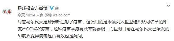 足球报表示,中国足协方面应与马尔代夫足协和亚足联就该情况进行交涉,确保马尔代夫来华代表团成员全部接种疫苗,并持有72小时内核酸检测阴性报告,并在入境后再次就地接受核酸检测并进行隔离。