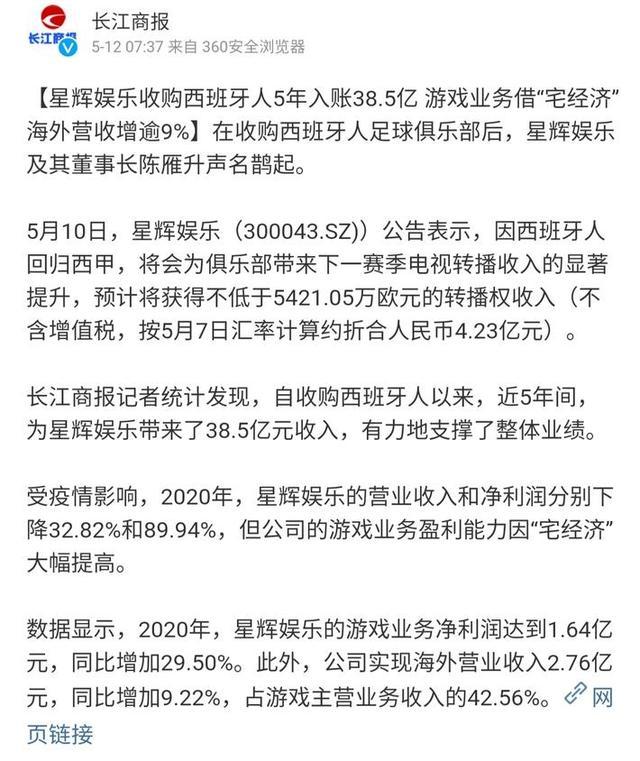 JRS直播网讯 今日,据《长江商报》报道,星辉娱乐董事长陈雁升自收购球队西班牙人5年来,已为公司带来了38.5亿元的收入。