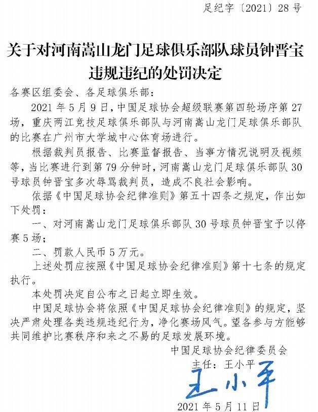 一、对河南嵩山龙门足球俱乐部队30号球员钟晋宝予以停赛5场;