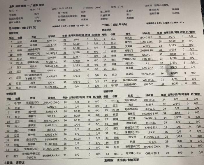 JRS直播网讯 北京时间5月9日,中超联赛继续进行,广州队对阵沧州雄狮,本场比赛卡纳瓦罗要带队冲击两连胜,本场比赛的首发名单公布。