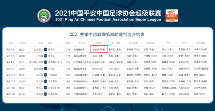 JRS直播网讯 北京时间5月7日,中国联赛官方公布第4轮裁判安排,石祯禄执法泰山队和青岛队的齐鲁德比大战,李海新连续4场执法,本轮执法大连人和天津津门虎的对决。