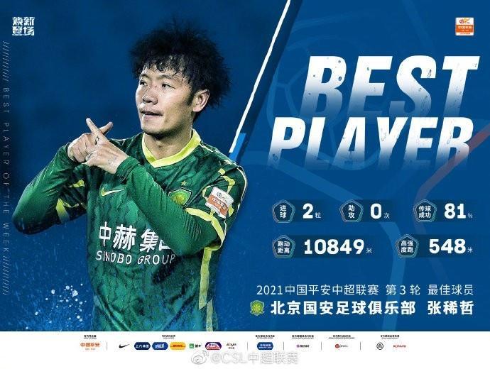 JRS直播网讯 今天,中超联赛官方公布了第三轮最佳球员评选结果,国安球员张稀哲以77.5%的得票率当选。