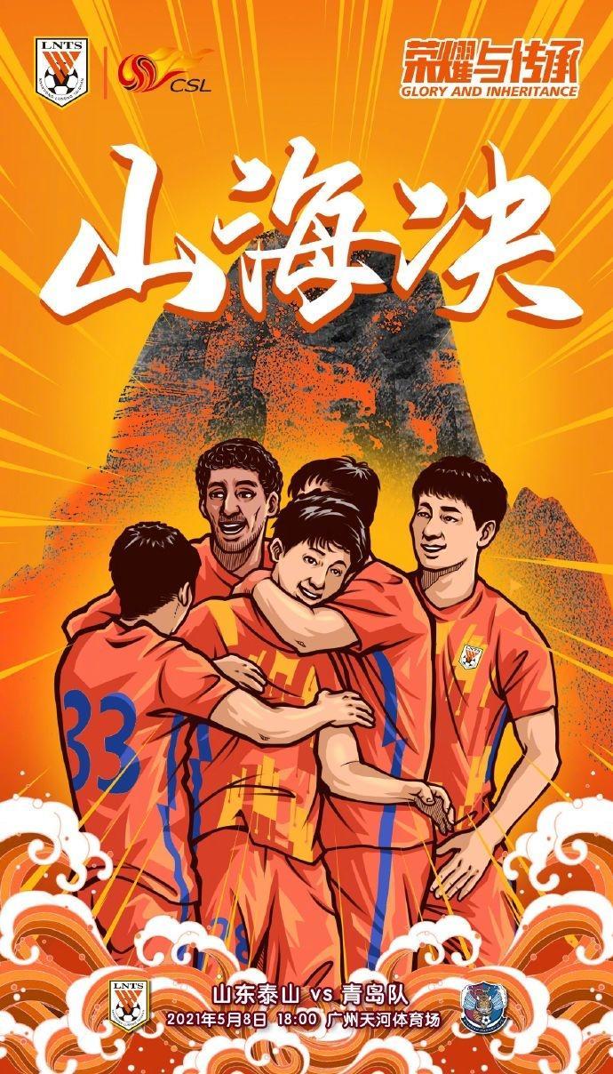 北京时间5月8日18:00,中超第4轮,山东泰山对阵青岛队。赛前,泰山队发布主题为“山海决”的海报为本场比赛预热,山代表山东泰山,海代表青岛队,海报主体以泰山队的橙色为背景色,诸位泰山球员在庆祝进球,表达了他们希望拿下本场比赛的决心。