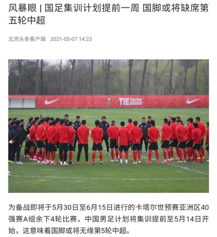 JRS直播网讯 5月7日据《北京青年报》报道,由于国足新一期的集训将提前开始,这意味着国脚或将无缘第5轮中超。
