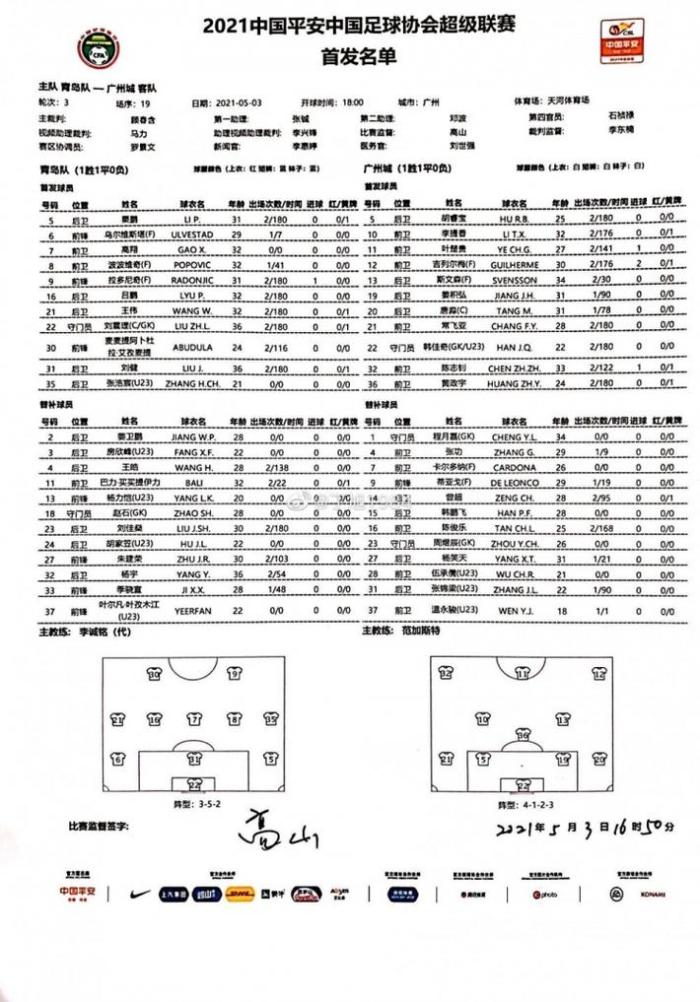 替补:1-程月磊,4-张功,7-卡尔多纳,9-蒂亚戈,14-曾超,15-韩鹏飞,16-陈俊乐,23-周煜辰,27-杨笑天,28-伍承儒(U23),31-张锦梁(U23),37-温永骏(U23