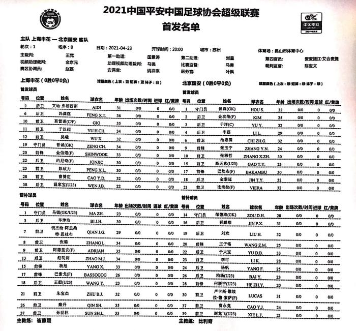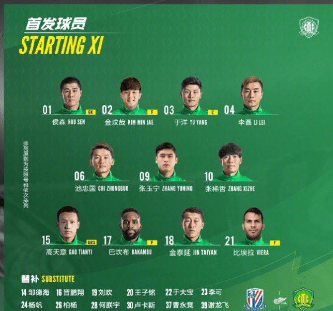 JRS直播网讯 北京时间4月23日,中超联赛第一轮,北京国安对阵上海申花,赛前,这场比赛的首发名单出炉。