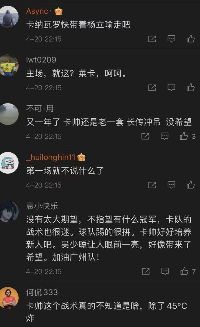 在这场略显遗憾的2比2之后,广州队新赛季要想重夺联赛冠军的前景,无疑早早的就蒙上了一层疑云。而尽管只是赛季首战,但是赛后不少愤怒的广州球迷还是再次来到了俱乐部的官方账号下面,在官微发布的赛后战报下面,纷纷气愤的表达了自己的不满。