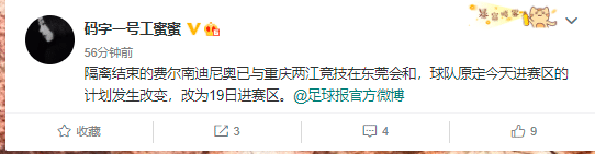 JRS直播网讯北京时间4月17日,据足球报记者鲁蜜报道,隔离结束的费尔南迪尼奥已与重庆两江竞技在东莞会和。