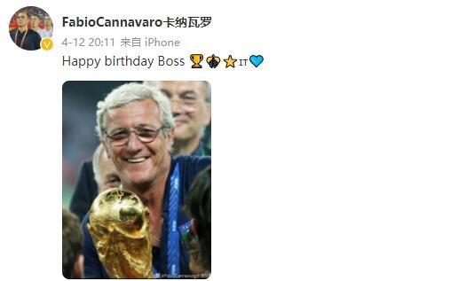 JRS直播网4月13日讯今天是前国足、广州队主帅里皮的73岁生日,作为他的昔日弟子,广州队主帅卡纳瓦罗通过微博送上了祝福。