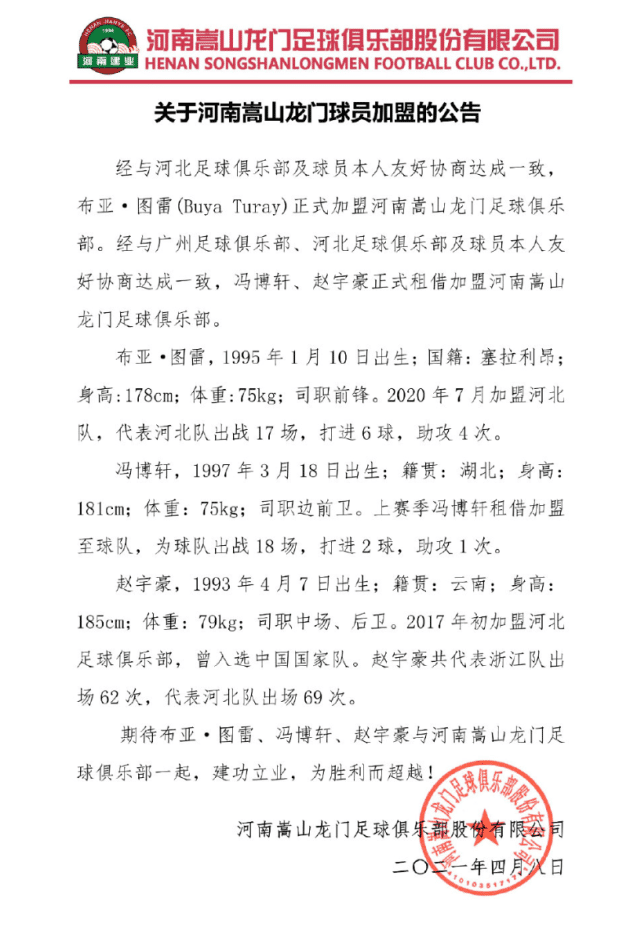 最终,河南建业把队名确定为“河南嵩山龙门队”。第二关就是主场问题,根据球队的公告可以了解到,建业嵩山龙门将会在郑州和洛阳建立双主场。队名、主场都制定好之后,下一步就是进行引援了。在4月8日,河南嵩山龙门官方宣布,河北华夏的布亚·图雷与赵宇豪,广州恒大冯博轩正式加盟到球队。值得一提的就是,冯博轩在上赛季就曾经租借到河南嵩山龙门,为球队出战18场,打进2球1助攻。好菜吃过以后经常牵挂,想再次品尝一番。冯博轩这样的好球员,也会得到河南嵩山龙门再次使用。