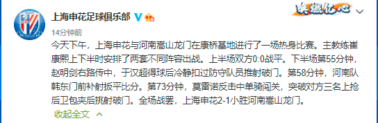 JRS直播网讯北京时间4月3日下午,在申花康桥基地进行的一场热身赛中,上海申花以2-1的比分击败了河南嵩山龙门。