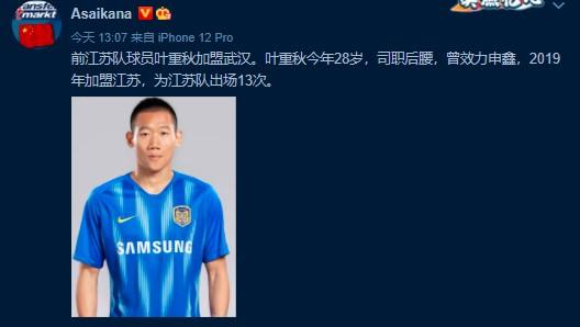 前江苏队球员叶重秋加盟武汉。叶重秋今年28岁,司职后腰,曾效力申鑫,2019年加盟江苏,为江苏队出场13次。