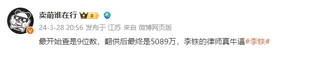 当然,她身上最大的标签就是名记付政浩曝出的,孙晓洋当年曾经代理过南勇的案件,所以她对于这类案件拥有专业的经验。值得一提的是,在首次庭审结束后,知名足球媒体人“卖萌谁在行”更新了社交媒体爆料:最开始查是9位数,翻供后最终是5089万,李铁的律师真牛气。