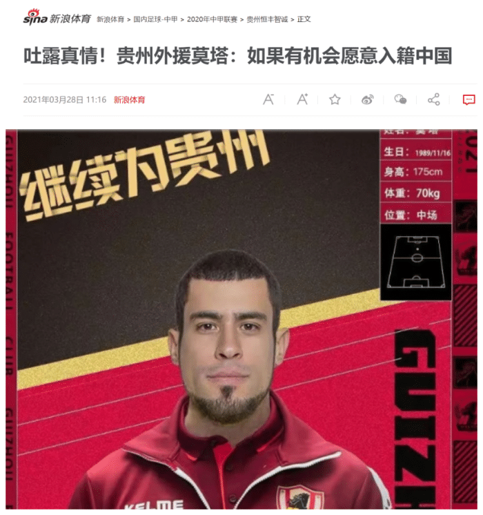北京时间3月28日,效力于中甲球队贵州队外援莫塔,接受采访时谈到了在中国踢球的经历。莫塔表示他非常喜欢在中国踢球,他喜欢中国文化,我觉得贵州是我的家,所以我选择在第一时间和贵州续约。