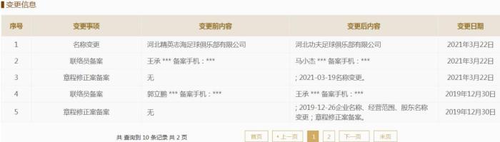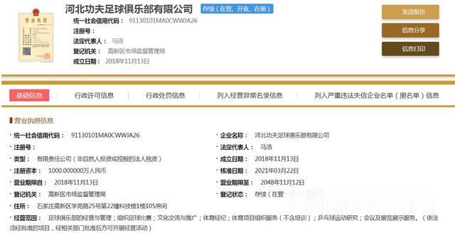 JRS直播网3月23日讯根据国家企业信息查询系统显示,河北精英足球俱乐部更名为河北功夫足球俱乐部。