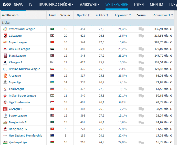 当然,世界所有联赛价值排名中前列的都是欧洲的联赛,那么亚洲方面呢?排名第一的是沙特联赛,他们的价值是3.3591亿欧元,而第二的是日本J1联赛,他们的价值是3.14亿欧元,第三就是中超联赛的2.89亿欧元。看来,不仅国家队,即便是联赛,在亚洲也没能排名第一。而随后的排名大家自己看看。而非洲联赛价值最高的是埃及联赛的1.47亿欧元。而美洲联赛中,除了美国大联盟以外,巴西联赛的价值是8.3亿欧元,阿根廷联赛的价值是8.1亿欧元,墨西哥联赛的价值是7.23亿欧元,哥伦比亚联赛的价值是2.47亿欧元。