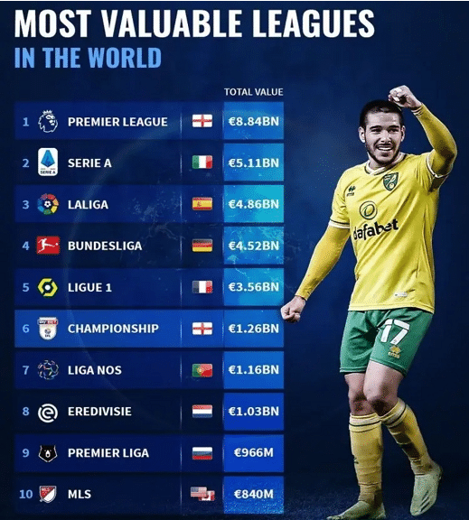排名前列的都是欧洲联赛,其中英超的价值是最高的,高达88.4亿欧元,也难怪英超被誉为足坛第一联赛。而排名第二的居然不是西甲,而是意甲联赛,他们的价值是51.1亿欧元,看来意甲的影响力依旧。第三的是西甲的48.6亿欧元,第四是德甲的45.2亿欧元,随后是法甲的35.6亿欧元,英冠的12.6亿欧元,葡超的11.6亿欧元,荷甲的10.3亿欧元和俄超的9.66亿欧元,而第十是美国大联盟的8.4亿欧元。可以看出,从世界排名来看,英超是最有价值的联赛。