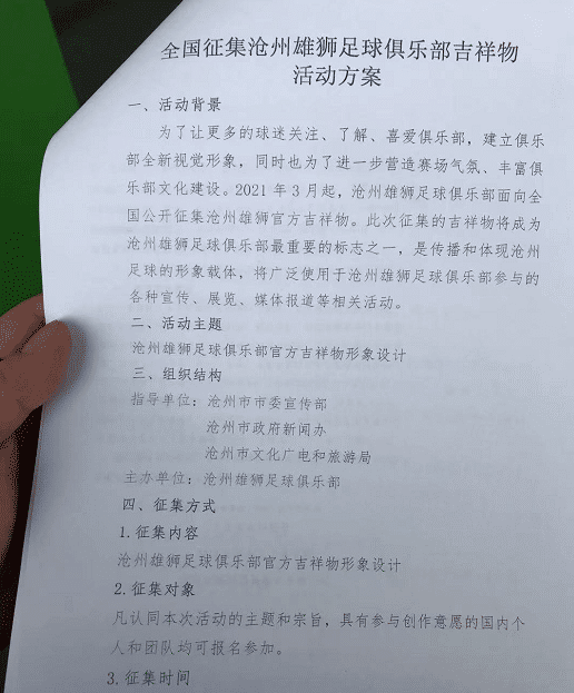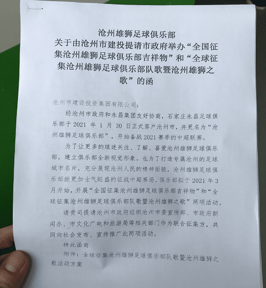 JRS直播网3月11日讯 今天,网络上传出沧州雄狮公开征集吉祥物和队歌的消息,相关的征集函也已经被曝光了,其实球队换了所在地之后重新征集吉祥物和队歌是很正常的,但是在沧州雄狮的征集函信息量却很大,其中最显眼就是“沧州雄狮足球俱乐部能够更加士气旺盛的征战中超联赛”。