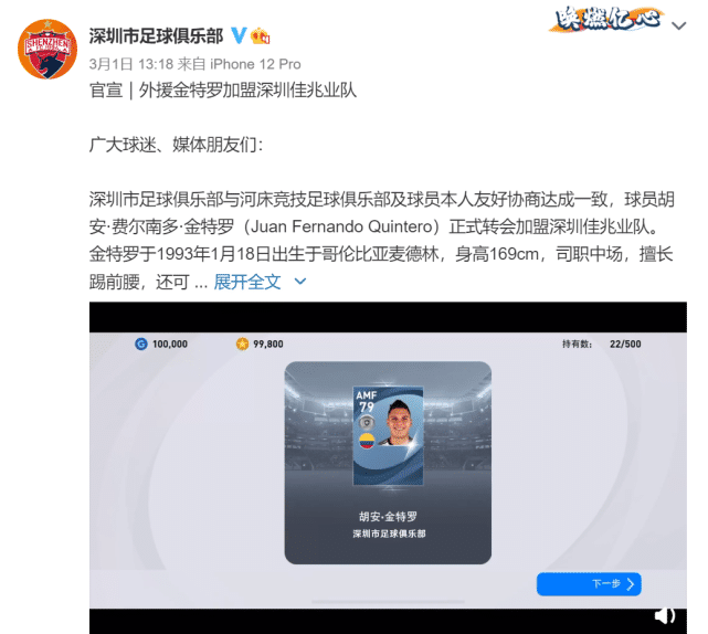 他从2018年效力阿根廷豪门球队河床征战三个赛季,60次出场攻入10球7助攻,并且球队夺得2018年南美解放者杯、2019年南美超级杯以及阿根廷杯冠军。当然,金特罗扬名立万的就是在2018年俄罗斯世界杯的优秀发挥,代表哥伦比亚4次首发登场,攻入3球1助攻。值得一提的就是,深圳佳兆业这一次官宣新援的方式十分特别,是通过球迷玩足球游戏“抽得”的。