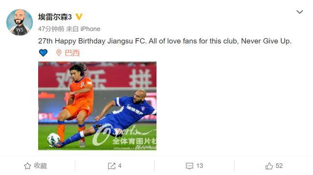 今天是江苏队的27岁生日,埃雷尔森先是在江苏球迷俱乐部的庆生微博下留言道:“有史以来最好的俱乐部,江苏是我家。”